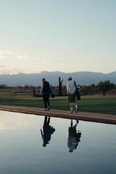 The course we’re on is one of a kind. Al Maaden’s gigantic rectangular pools pay homage to the famous Menara gardens of Marrakech, apparently “opening the sport to a modern and artistic universe.” 12 monumental art works adorn various holes of Al Maaden, custom-made sculptures that tower over the tee boxes. Towering over them are the monolithic Atlas Mountains baking in the African sun, As a simple band of travelling Brits we are awe struck, and sunburnt.