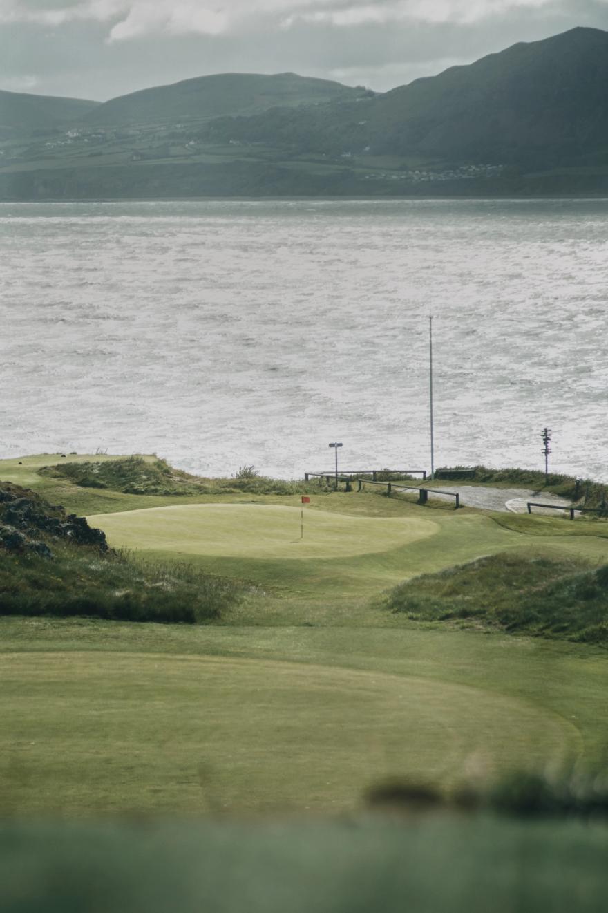 But for all of its epic build up, the opening tee shot is a little ambiguous. A sliver of fairway is truncated at the 220 yard mark by a dense thicket of gorse and knee high grass that extends uphill to a blind summit, obscuring the epic landscape beyond. Playing directly into the gale force westerly, the group fires ball after ball into the Welsh wilderness. Concern washes over us. Battling to drown out the white noise Ashley shouts ‘if we put the sunglasses on, the sun will come out, right?’