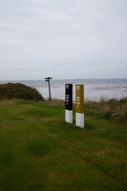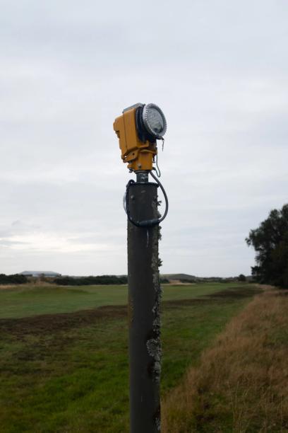 But it’s not all subtlety at Moray Old. On the par 3 15th, The North Sea crashes onto the West Beach over the dunes to the left. Marram filled hollows stretch out to an expansive, partially visible green that slopes heavily from front right to back left. Protruding from the fringe on the left side of the green are the landing lights that guide the fighter jets home. Dense grass and heather wrap around their base in an attempt to integrate them into their natural world.